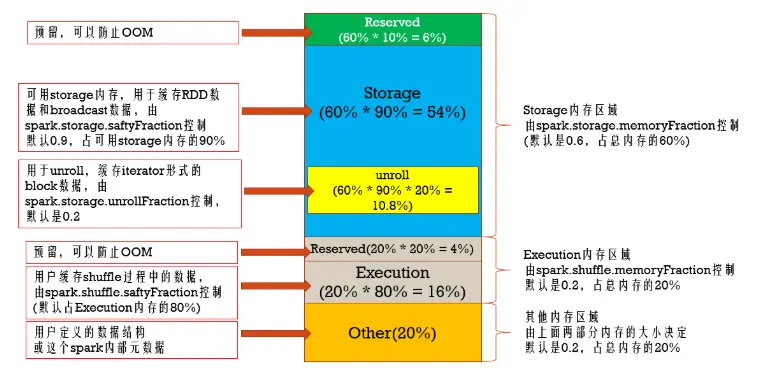 - 参数说明:(Spark1.6是这个参数,1.6以后参数变成spark.memory.fraction)该参数代表了Executor内存中,分配给shuffle read task进行聚合操作的内存比例,默认是20%。
