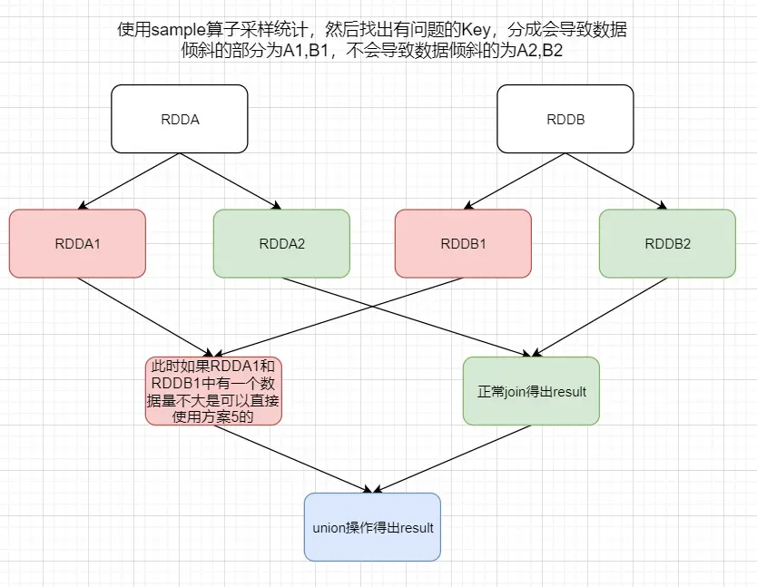 到这一步我们可以得出这个套路,如果RDDA1或者RDDB1中有一份数据量较小可以满足方案5的条件,那就直接执行方案5