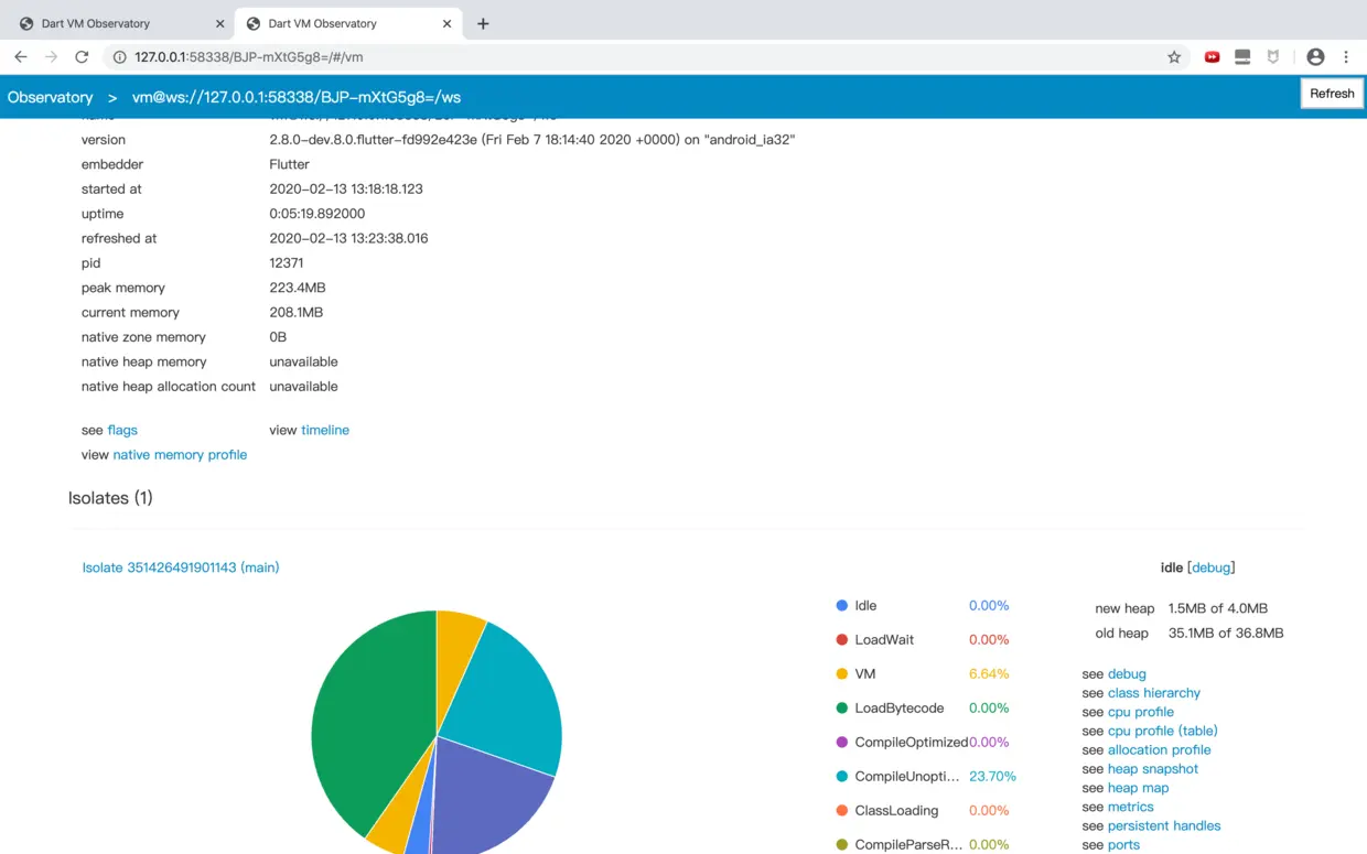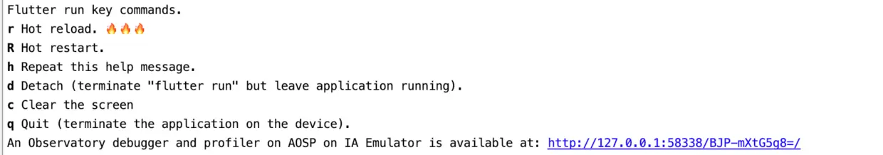 terminal中输入flutter run,如果要使用真机测试则输入flutter run --profile。成功后会出现如图所示的网址,不过这个网址适合在Google浏览器中进行显示。