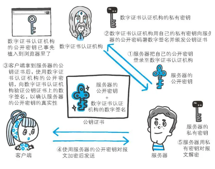 使用由数字证书认证机构(CA,Certificate Authority)和其相关机关颁发的公开密钥证书。