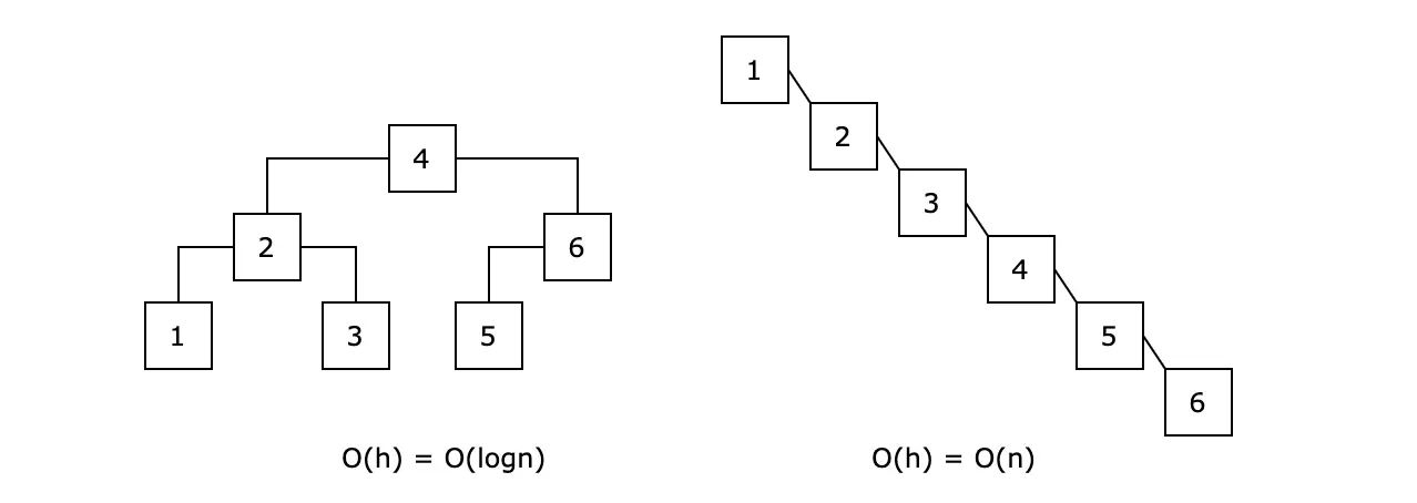 一棵二叉搜索树平均时间复杂度可以认为是树的高度 O(h)。像左边这棵,结点的左右子树的高度接近,属于一棵平衡二叉搜索树,O(h) = O(logn);而右边这棵,高度达到了最大,已经退化成了链表,O(h)=O(n)。