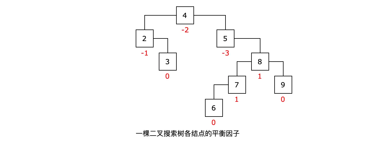8 的左子树高度为 2,右子树高度为 1,因此它的平衡因子为 1;5 的左子树高度为 0,右子树高度为 3,因此它的平衡因子为 -3;4 的左子树高度为 2,右子树高度为 4,因此它的平衡因子为 -2;
