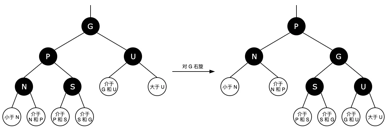 由红黑树性质4可知:红色结点不能连续。那么此时该插入子树的红黑层数的情况是:黑-红-红。显然最简单的处理方式就是将其改为:红-黑-红。