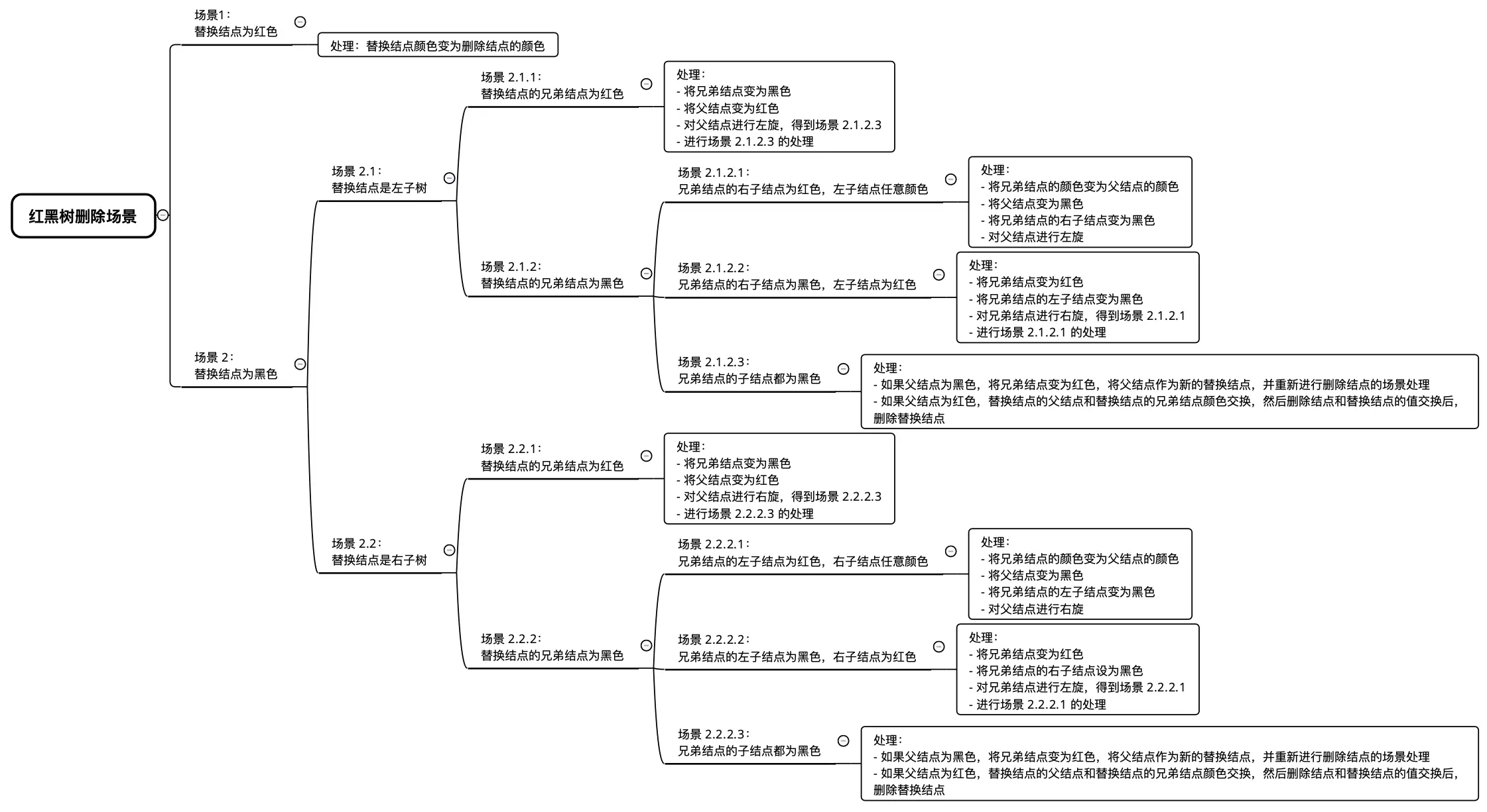 当兄弟结点为黑时,其父结点和子结点的具体颜色也无法确定,此时又得考虑多种子场景。