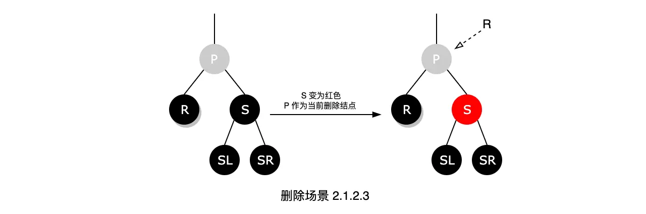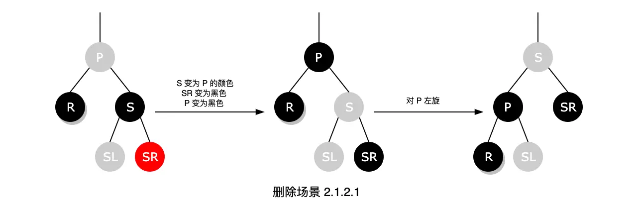 若兄弟结点是红结点,那么根据红黑树性质4,兄弟结点的父结点和子结点肯定为黑色,按照下图方式处理,得到删除场景 2.1.2.3。