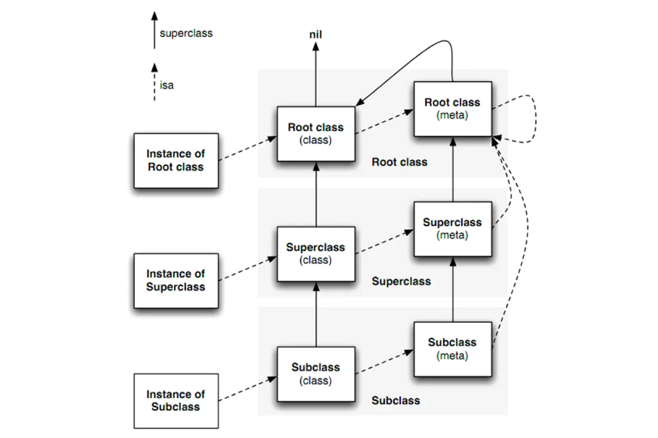 当向对象发消息,runtime 会在这个对象所属类方法列表中查找发送消息对应的方法,但当向类发送消息时,runtime 就会在这个类的 meta class 方法列表里查找。所有的 meta class,包括 Root class,Superclass,Subclass 的 isa 都指向 Root class 的 meta class,这样能够形成一个闭环。