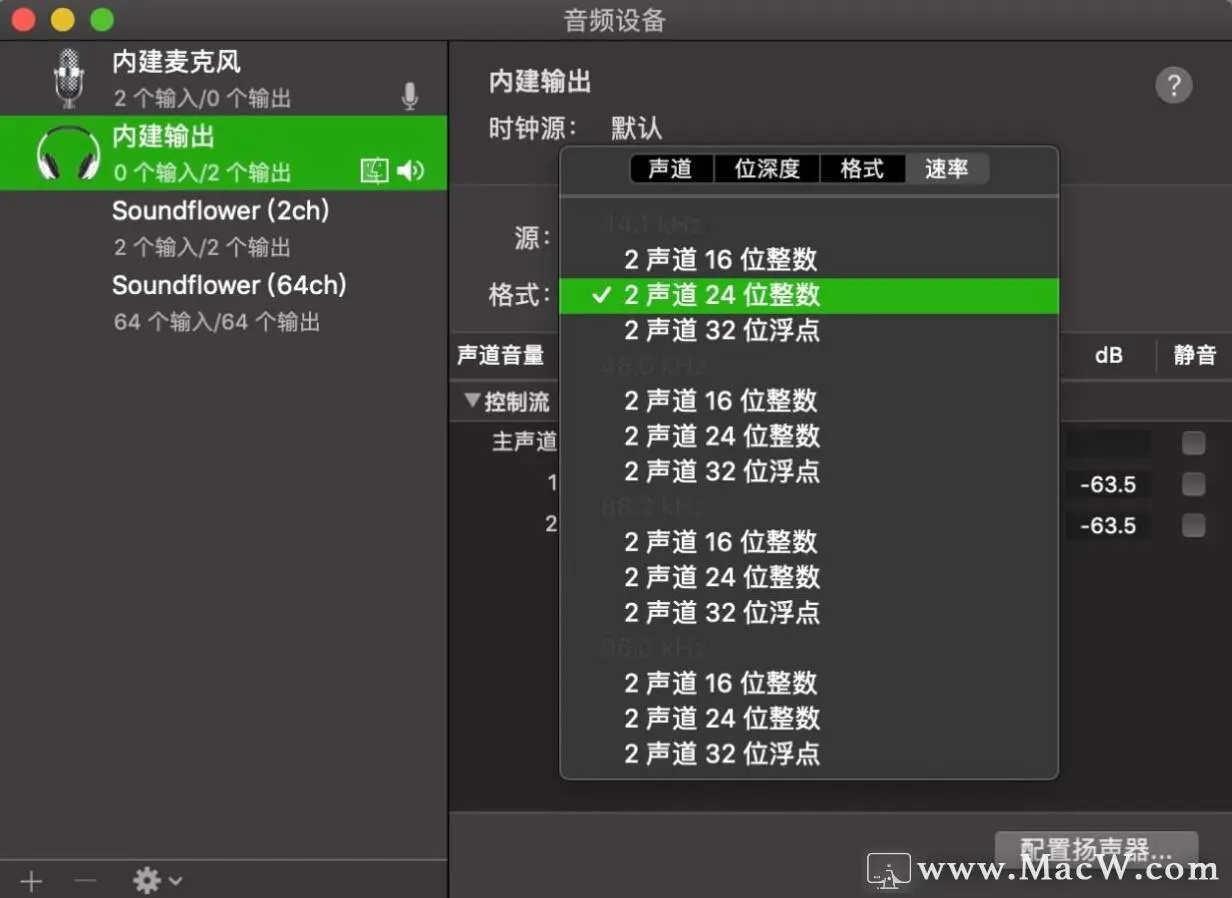 在内建输出中可以设置音频声道、位深度、格式、速率。调整后退出应用,然后尝试再次播放音频。