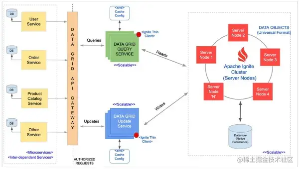 由于插入到缓存中的数据是基于更新服务来部署缓存的,因此它确保了在任何微服务中的更新数据,都会在数据网格中可用。此外,由于Ignite具有持久性,因此我们可以添加任意数量的节点,以支持来自各种服务的大型数据集。