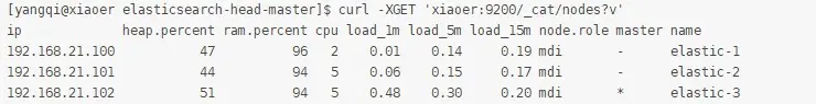 [yangqi@xiaoer ~]$ curl -XGET 'xiaoer:9200/_cat/nodes?v'