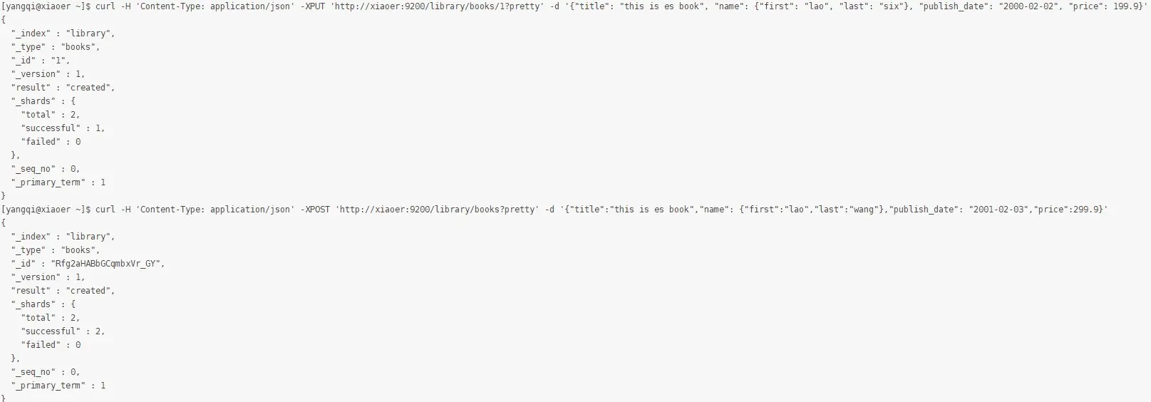 [yangqi@xiaoer ~]$ curl -H 'Content-Type: application/json' -XPUT 'http://xiaoer:9200/library/books/1?pretty' -d '{