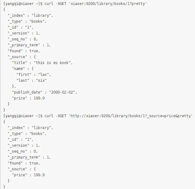 [yangqi@xiaoer ~]$ curl -XGET 'http://xiaoer:9200/library/books/1?_source=price&pretty'