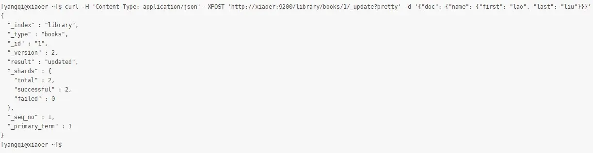 [yangqi@xiaoer ~]$ curl -H "Content-Type: application/json" -XPOST 'xiaoer:9200/library/books/1/_update?pretty' -d '{