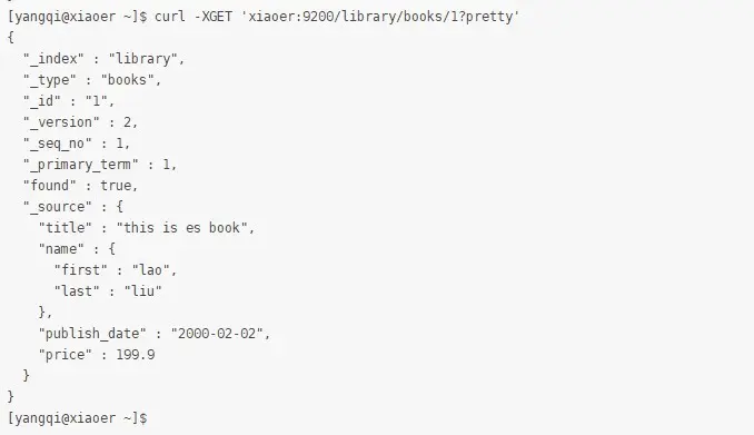 [yangqi@xiaoer ~]$ curl -XGET 'xiaoer:9200/library/books/1?pretty'