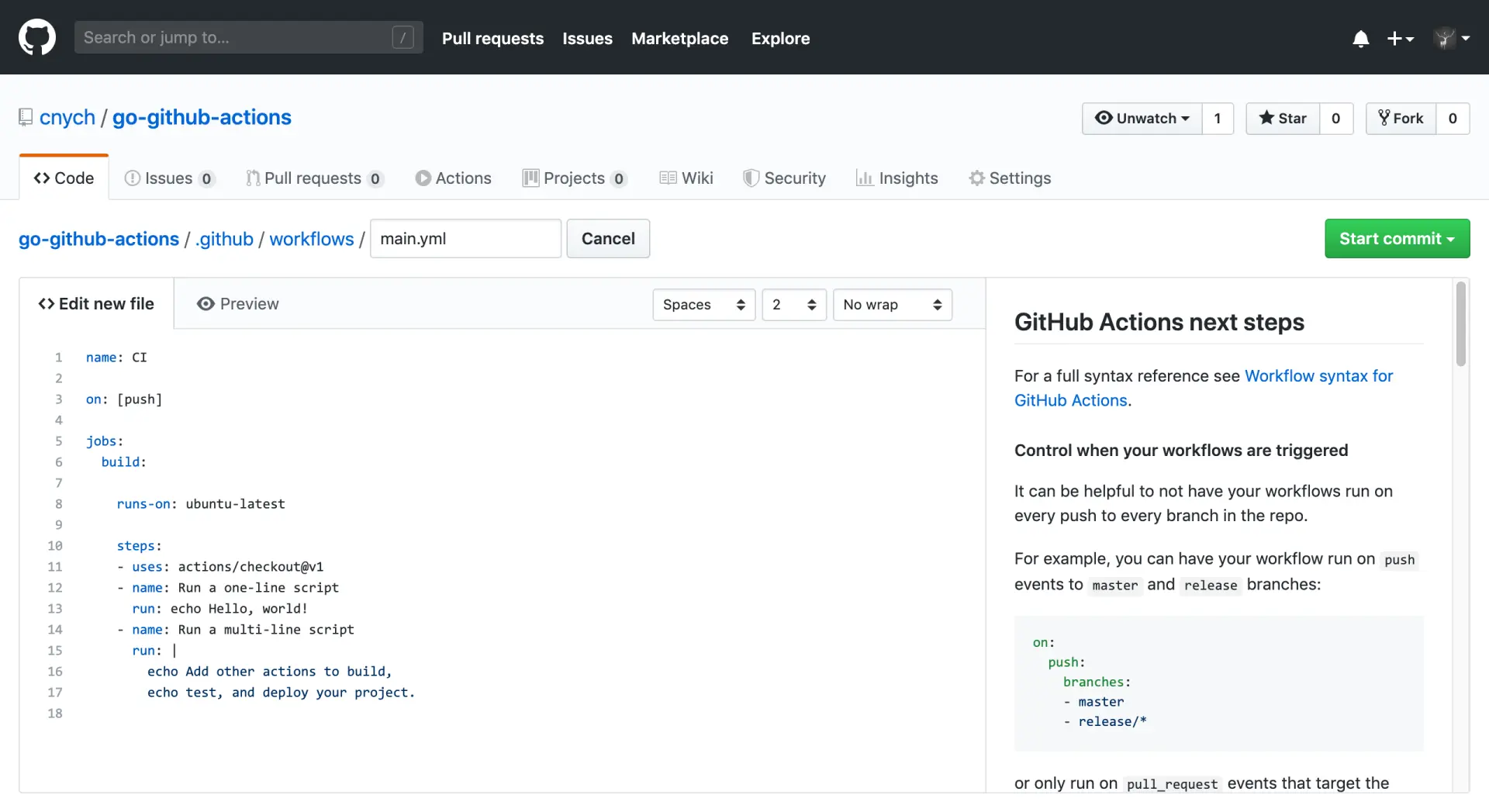 在 GitHub 上新建一个名为 go-github-actions 的仓库,在项目根目录下面创建一个 main.go 文件,内容如下所示: