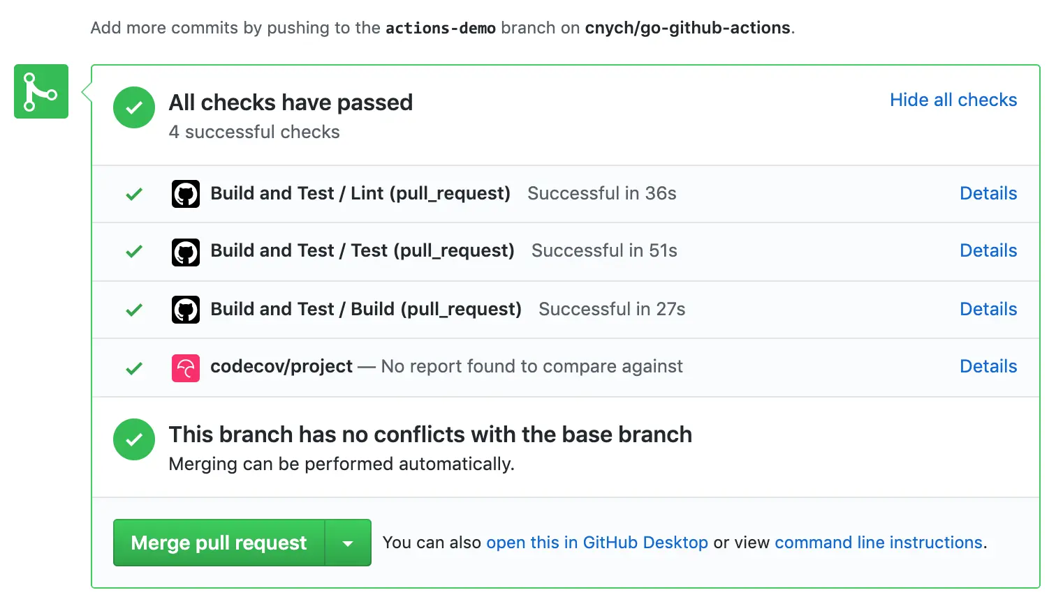 当任务执行完成后就可以进行 Merge 操作了: 上面在 workflow 中我们还和 CodeCov 进行了集成,所以我们可以看到 PR 的状态检查和 Coverage 代码覆盖报告: