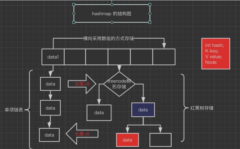 HashMap是java里面以Key-value存储的一种集合对象,它使用的是数组加上链表的结构(1.8之后增加了红黑树),它允许key和value为null,是一种无序并且线程不安全的集合对象,以下是他的结构图。