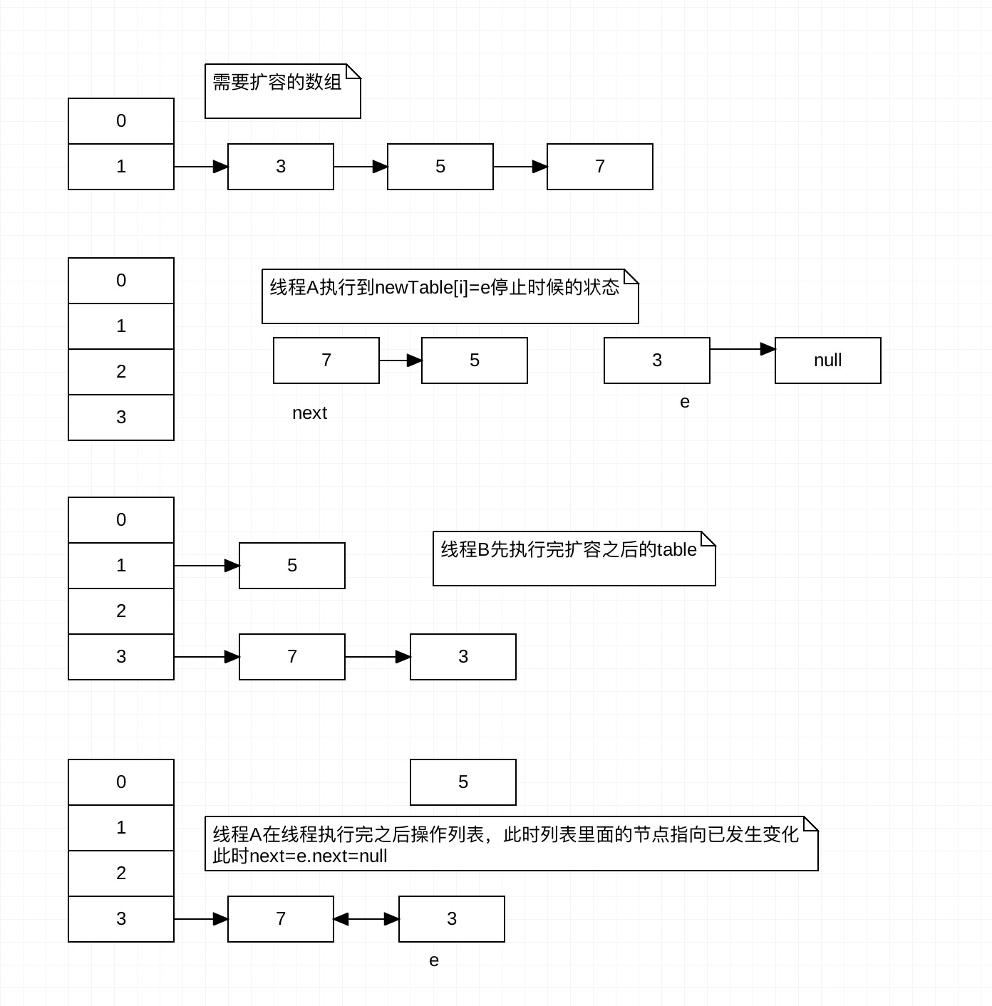 - 多线程的情况下运行。出现的问题则体现在 e.next = newTable[i];单个线程运行的情况下则是不会有问题。当线程A运行完整个扩容代码之后,线程B去进行