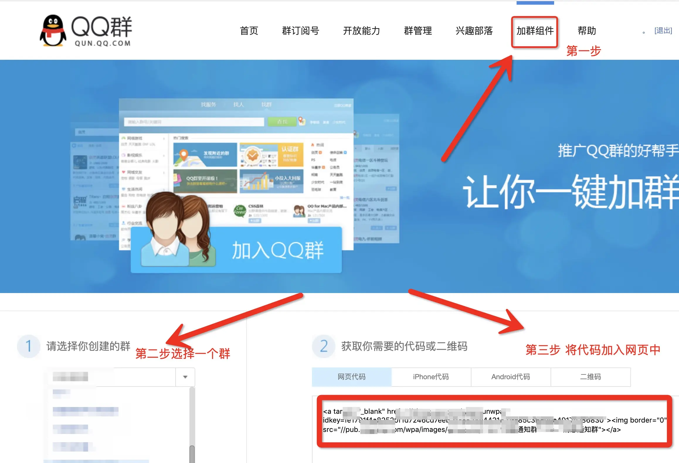 第三步:选择 【复制加群链接】,将链接加入网页中
