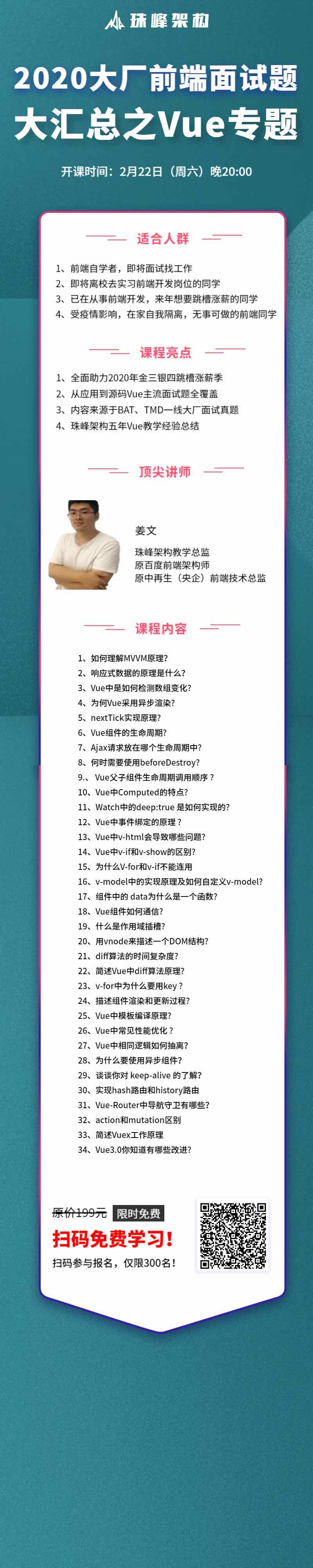 昨天报名了一个VUE专题的讲课视频,大体如下图,主要讲解常见的vue面试题,授课时间是今天8点。于是我提前整理学习了前十道问题的答案,算是提前预习了吧。也欢迎大家一起入群学习。