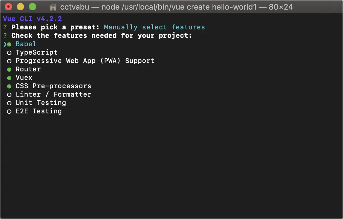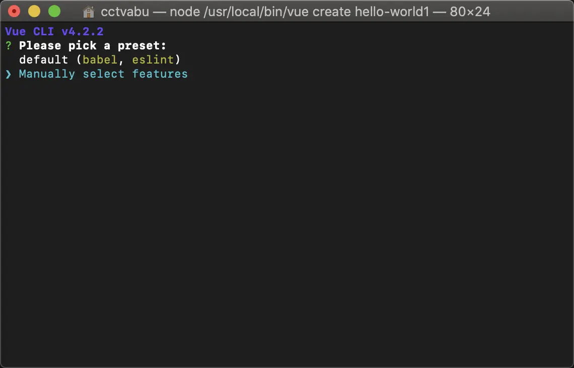你会被提示选取一个 preset。你可以选默认的包含了基本的 Babel + ESLint 设置的 preset,也可以选“手动选择特性”来选取需要的特性。