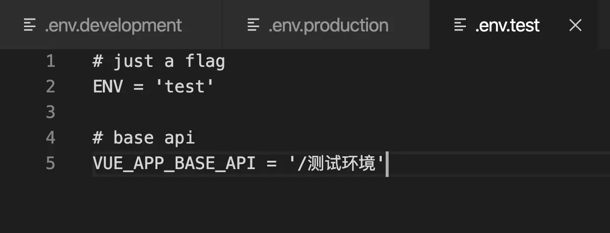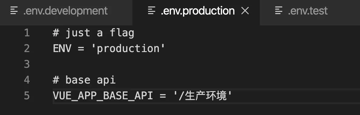在3.x版本中,我们直接在根目录下新建.env.development与.env.production还有.env.test文件用来设置不同环境下的某些变量的不同属性。例如: