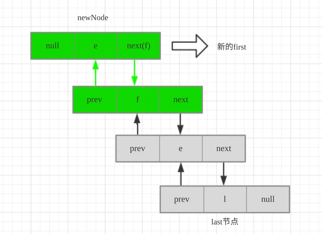 - 如果前驱为null,说明x为首节点,first指向x的后继,x的前驱的后继指向x的后继,即略过了x.