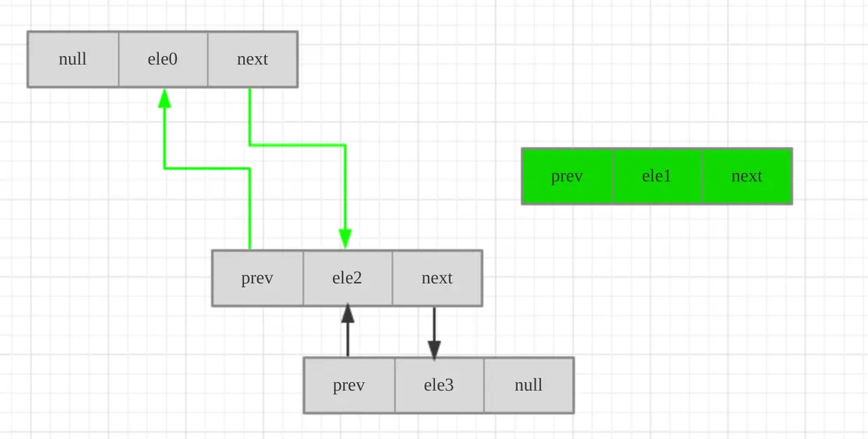 // 前置节点为pred,后置节点为null,当前节点值为e的节点newNode