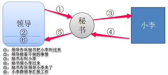 我们看下面这幅图:领导让秘书帮助自己叫小李,然后自己做别的事情。秘书找啊找找到小李后,小李向领导汇报工作是生活中的常见场景。
