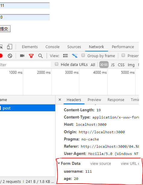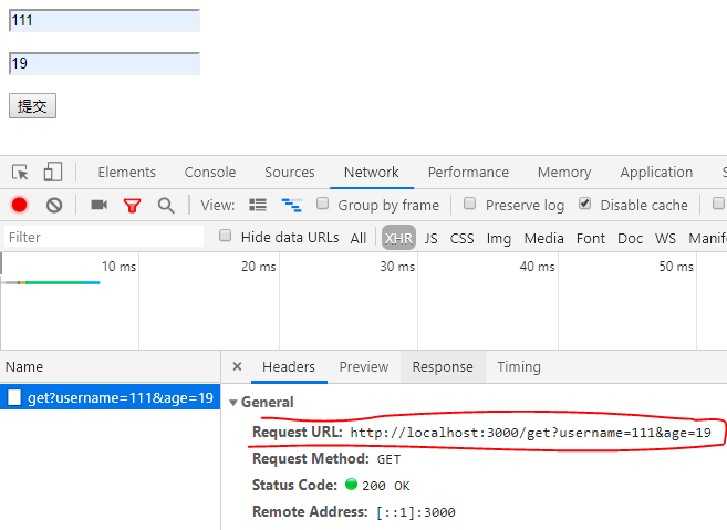 在页面中输入姓名111和年龄19.打开开发者工具查看xhr请求,我们看到请求参数没有问题。拼接成功,见下图红色部分中问号后面部分就是拼接的请求参数。