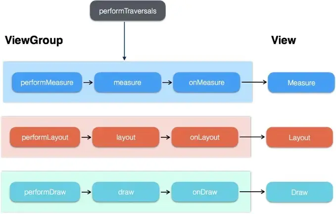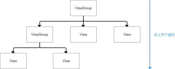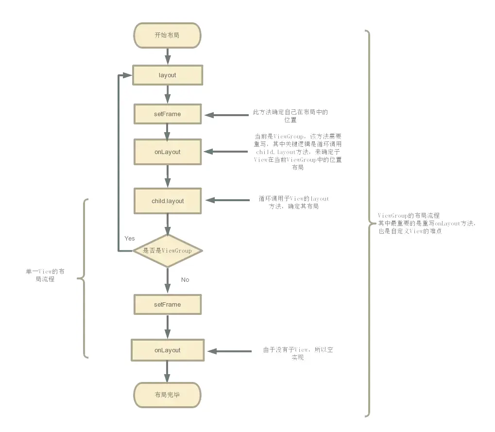 其中布局也是自上而下,不同的是ViewGroup先在layout()中确定自己的布局,然 后在onLayout()方法中再调用子View的layout()方法,让子View布局。在Measure 过程中,ViewGroup一般是先测量子View的大小,然后再确定自身的大小。