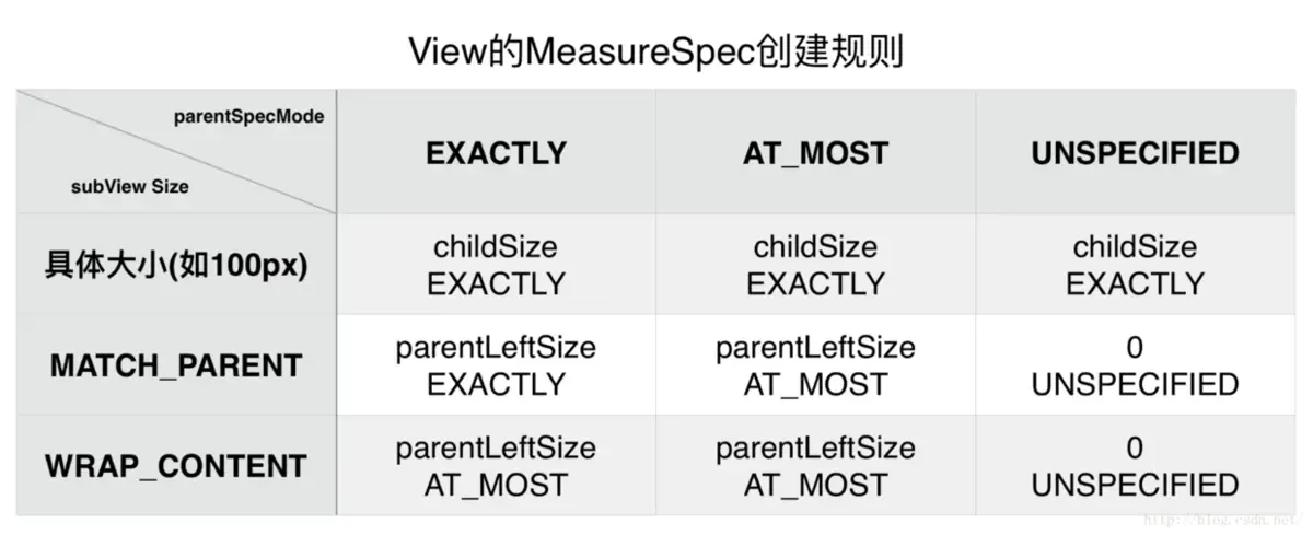 这部分很简单,根据LayoutParams的布局格式(match_parent,wrap_content或 指定大小),将自身大小,和屏幕大小相比,设置一个不超过屏幕大小的宽高,以 及对应模式。 对于其他View(包括ViewGroup),其确定是通过父布局的MeasureSpec和自身的 布局参数LayoutParams。 这部分比较复杂。以下列图表表示不同的情况: