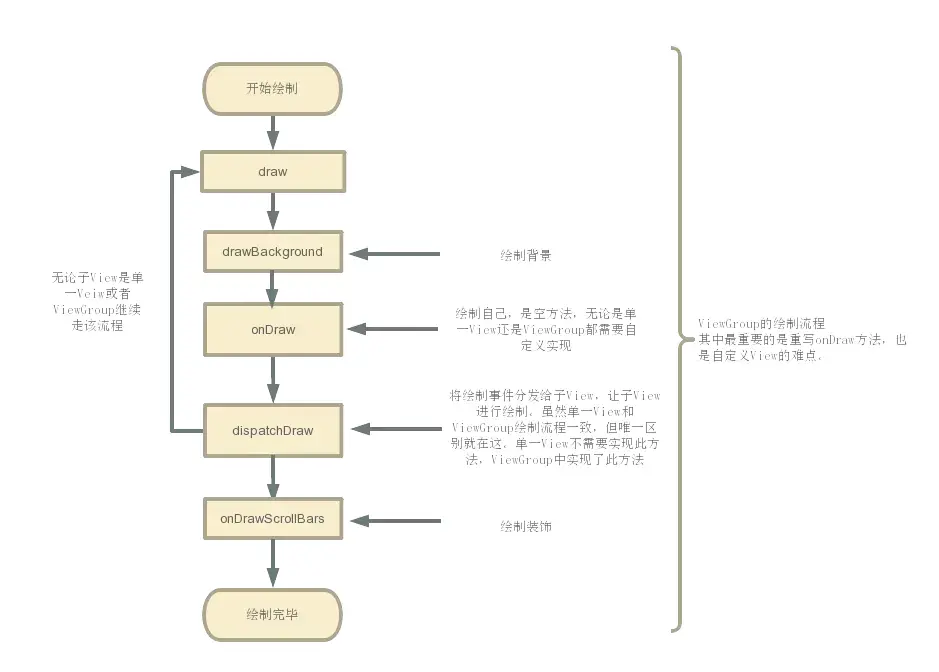 无论是ViewGroup还是单一的View,都需要实现这套流程,不同的是,在 ViewGroup中,实现了 dispatchDraw()方法,而在单一子View中不需要实现该方 法。自定义View一般要重写onDraw()方法,在其中绘制不同的样式。