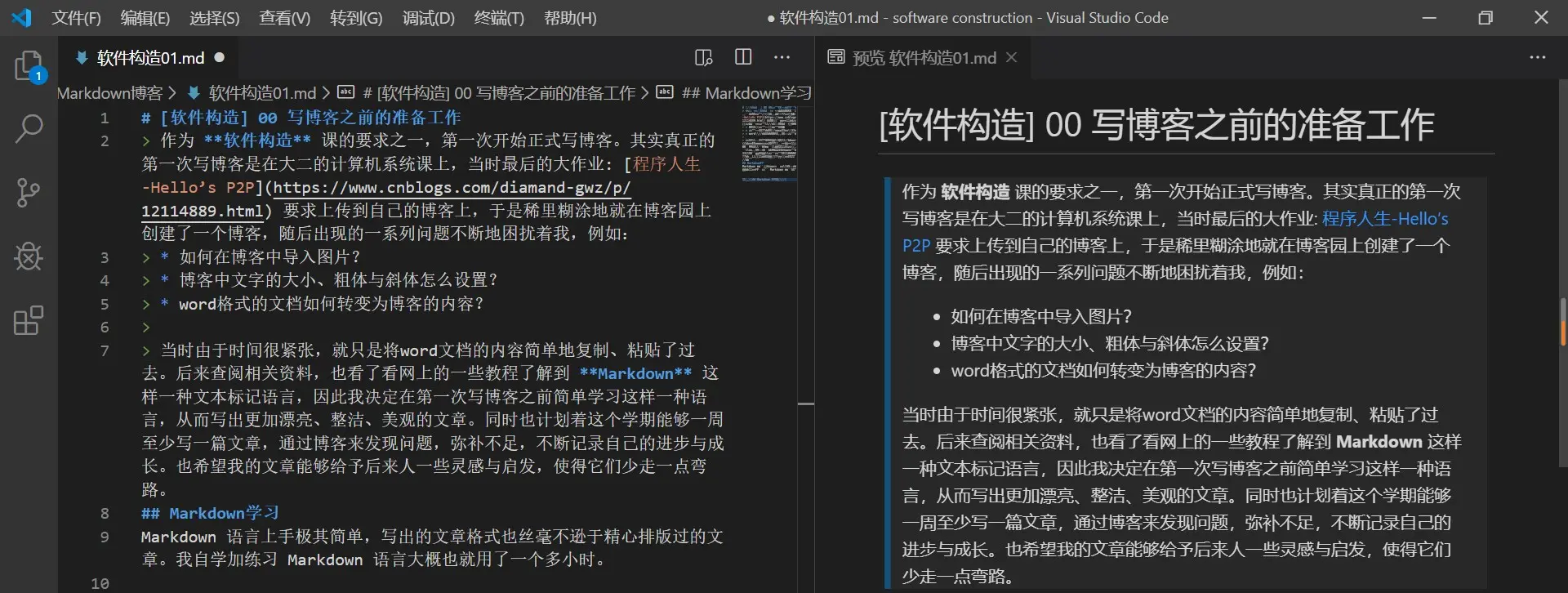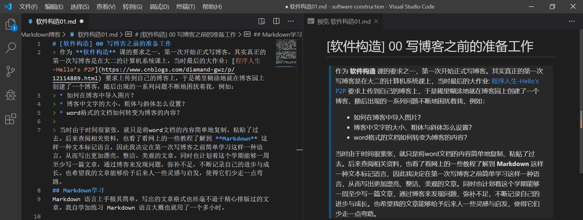 我使用的 Markdown 编辑器是 VSCode,编辑时的界面大概就是这样的: