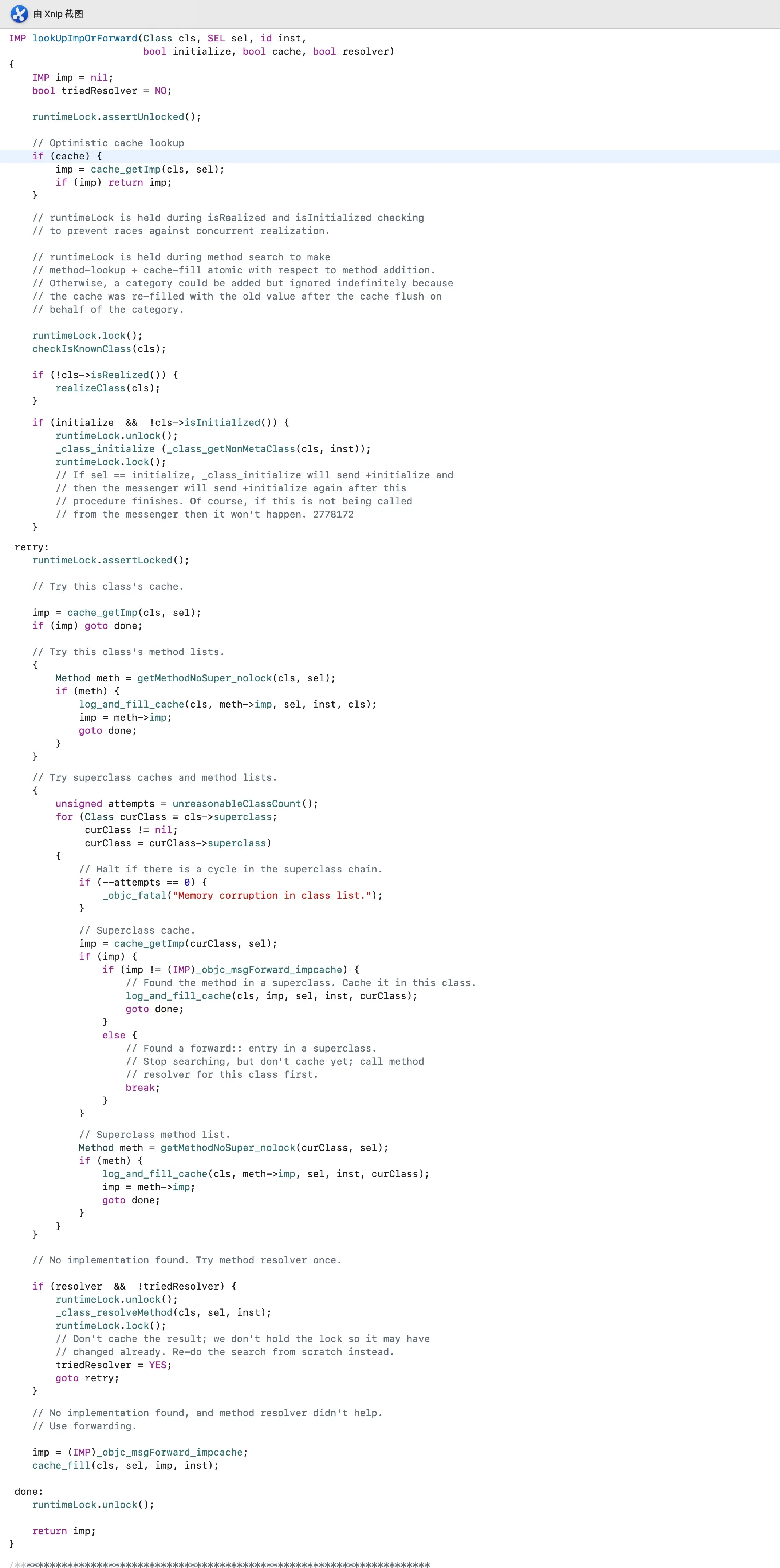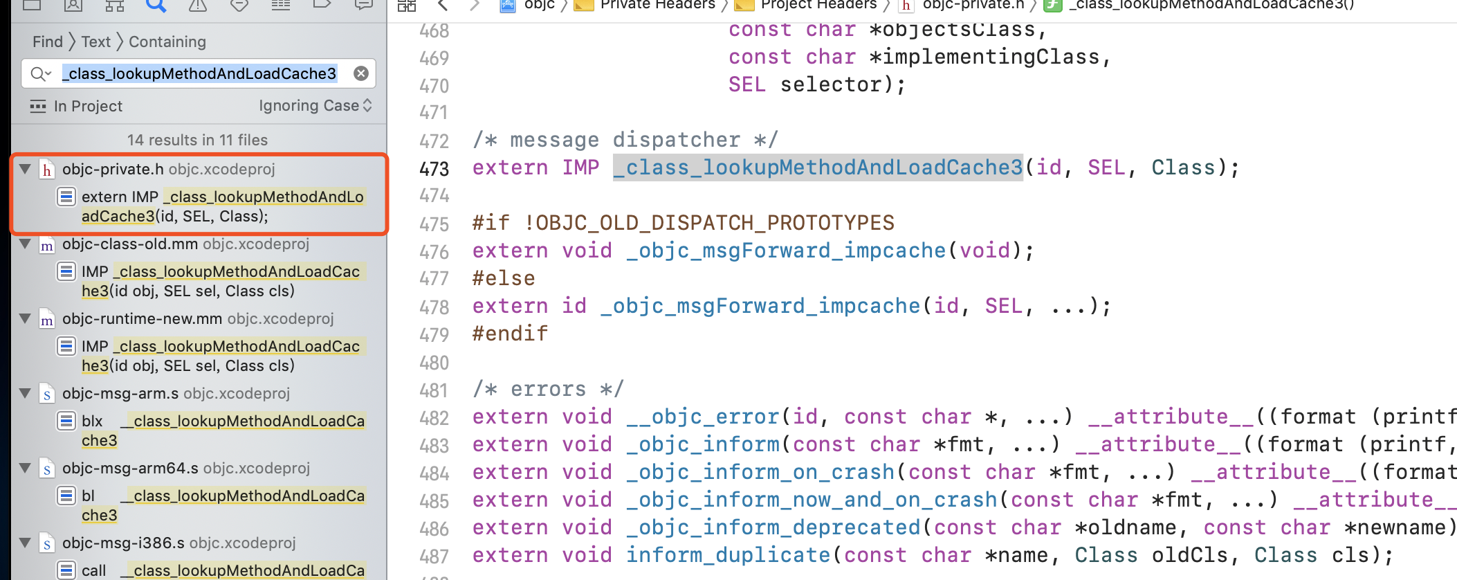 在Xcode中搜索_class_lookupMethodAndLoadCache3,并选择搜索结果中的第一个,然后选择右边的api,看看接下来做了什么。