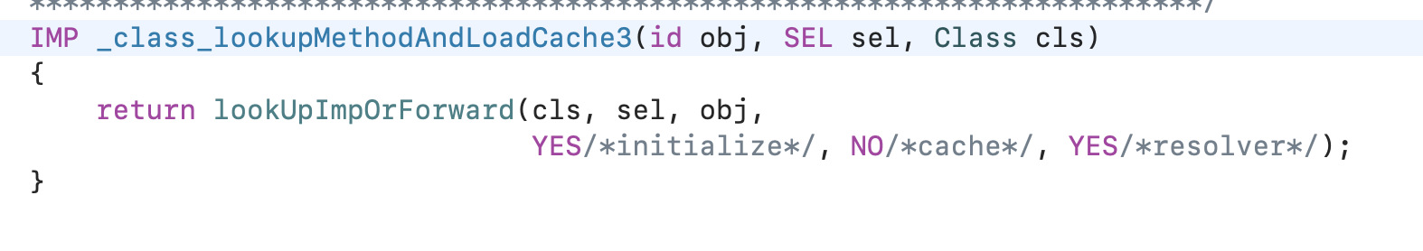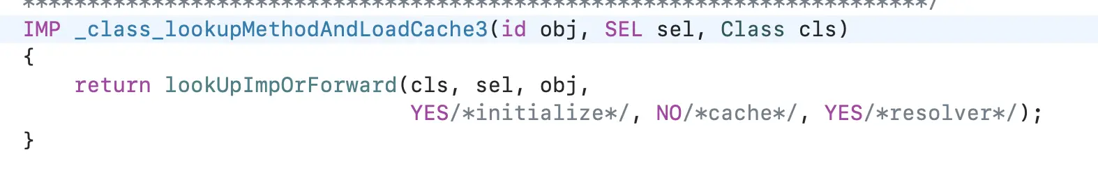 可以清楚的看见,在_objc_msgSend_uncached之后是调用了_class_lookupMethodAndLoadCache3,并且是有源码的,接下来我们进入源码部分看看。