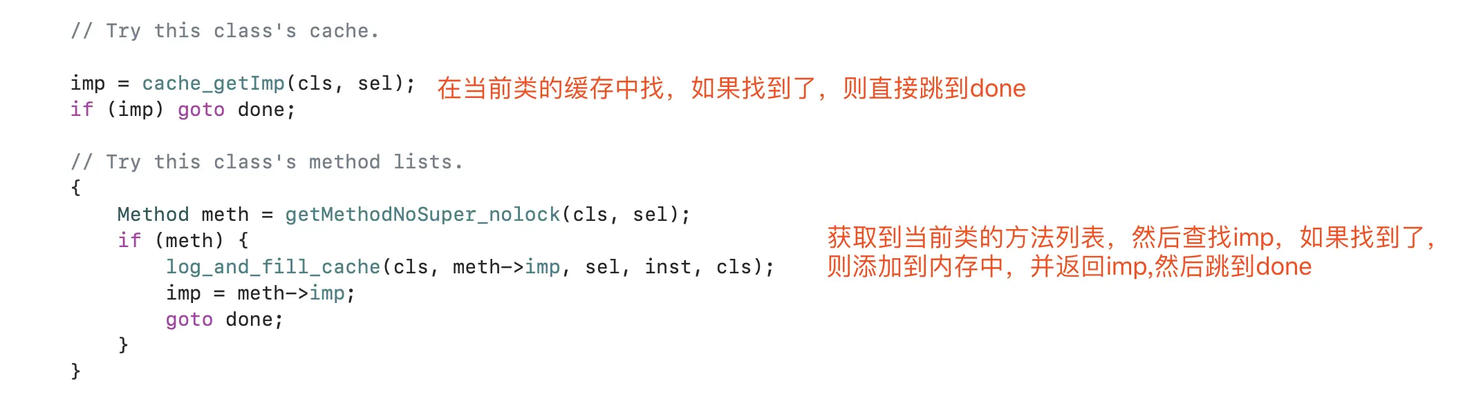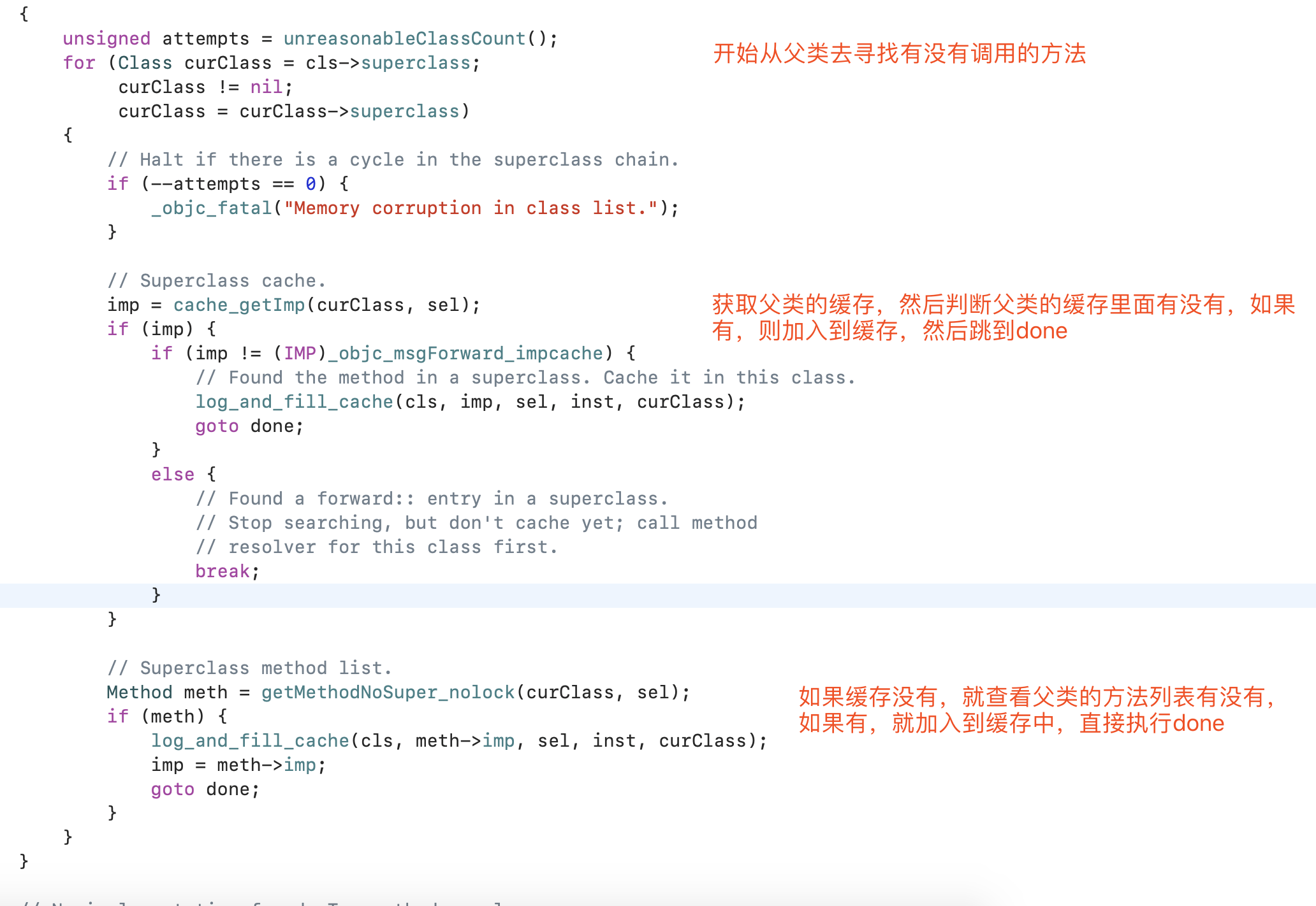 1、如果objc_msgSend中没有缓存,则会进入class_lookupMethodAndLoadCache3 进行慢速递归查找
