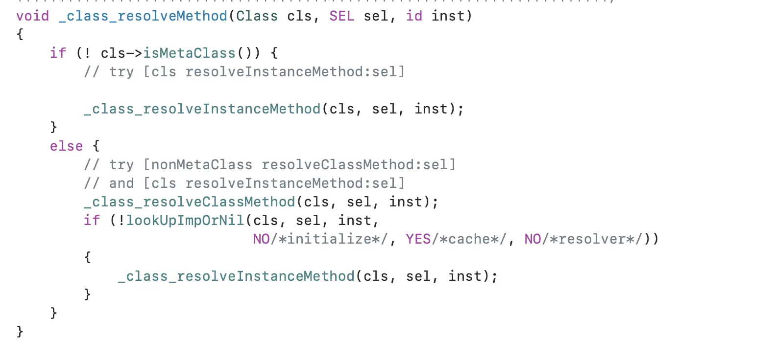 首先会判断cls是不是元类,如果不是,就是对象方法,会调用_class_resolveInstanceMethod,如果是,就是类方法,会调用_class_resolveClassMethod方法。