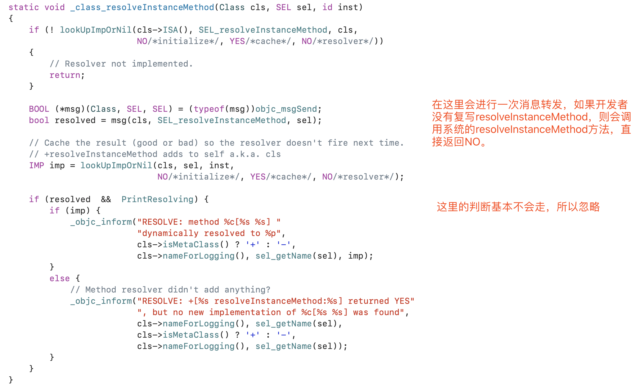 当系统在父类也没有找到sel的时候,就会进入动态消息转发。此时我们进入_class_resolveMethod看一下源码: