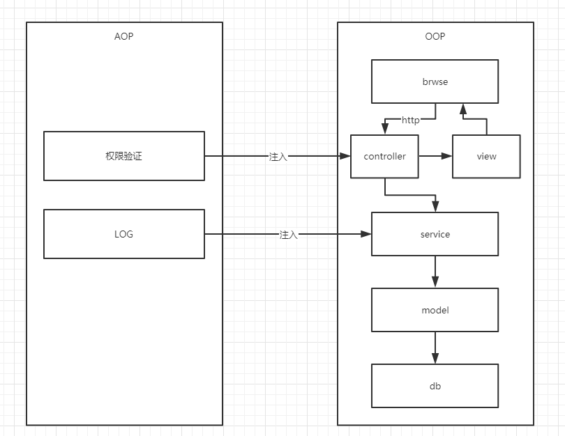 OOP面向对象编程,针对业务处理过程的实体及其属性和行为进行抽象封装,以获得更加清晰高效的逻辑单元划分。而AOP则是针对业务处理过程中的切面进行提取,它所面对的是处理过程的某个步骤或阶段,以获得逻辑过程的中各部分之间低耦合的隔离效果。这两种设计思想在目标上有着本质的差异。