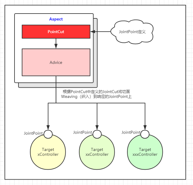 - Aspect(切面): Aspect 声明类似于 Java 中的类声明,在 Aspect 中会包含着一些 Pointcut 以及相应的 Advice。