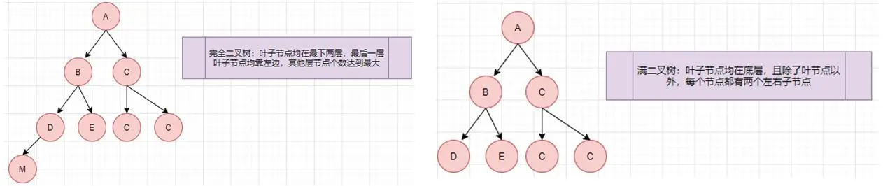 二叉树,在树的基础上加了属性词"二叉",两个分支,其实上面咱们所画的树就是二叉树。那么特殊的二叉树值得注意的是完全二叉树和满二叉树,如下图所示。