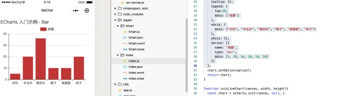<view class="container"> <ec-canvas id="mychart-dom-bar" style="width:100%;height:300px;" canvas-id="mychart-bar" ec="{{ ec }}"></ec-canvas> </view> //option var option = { title: { text: 'ECharts 入门示例- Bar' }, tooltip: {}, legend: { top:30, data: ['销量'] }, xAxis: { data: ["衬衫", "羊毛衫", "雪纺衫", "裤子", "高跟鞋", "袜子"] }, yAxis: {}, series: [{ name: '销量', type: 'bar', data: [5, 20, 36, 10, 10, 20] }] } -