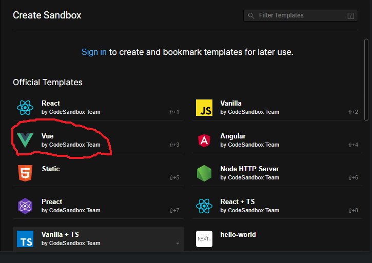 - Create a sandbox ->选择Vue ->这样就创建好了。