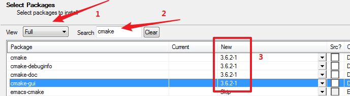 比如说需要 cmake,就可以先在 View 中选择 Full,然后在 search 中输入 cmake 关键字,接着在 New 列中,选择所需要的版本: