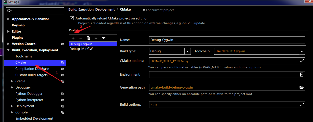 接着,配置 CMake,为其指定一个新的基于 Cygwin 的 Profile: