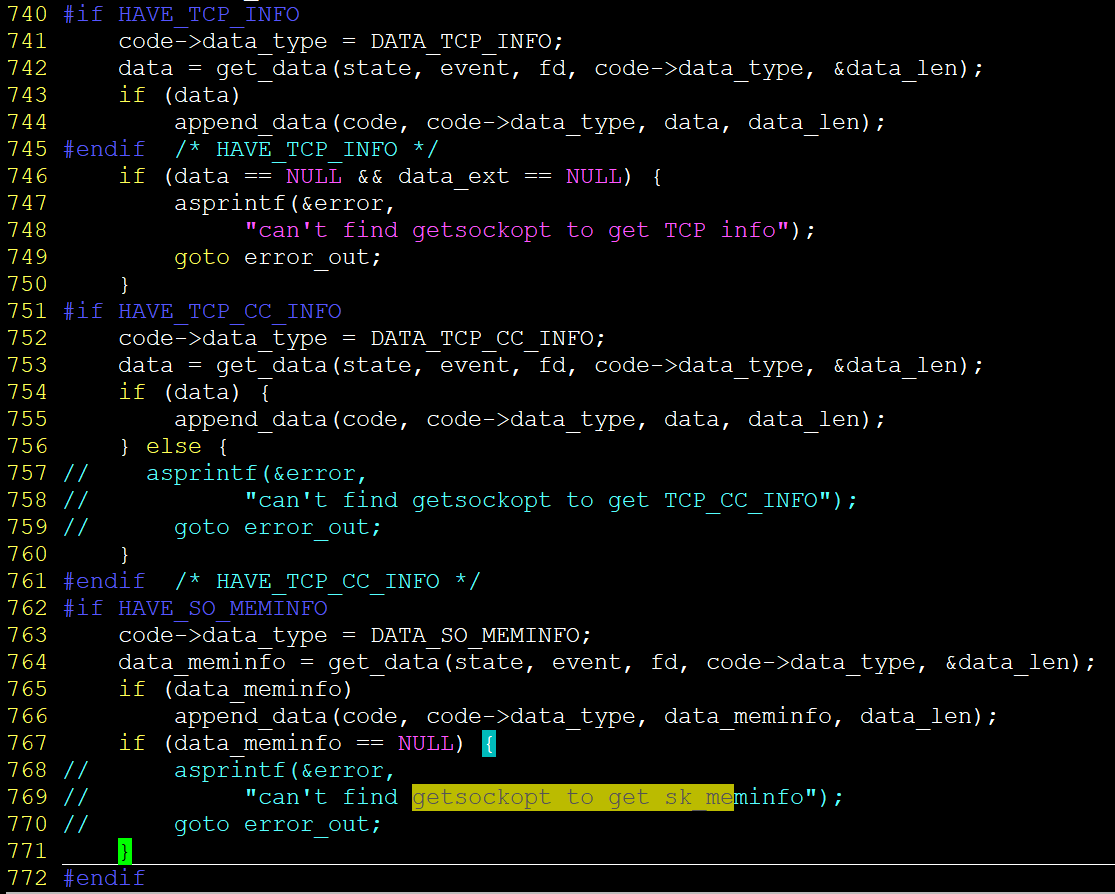 - 找到跟code.c同一文件夹下的platforms.h文件,修改其中的宏定义为1,比如说HAVE_TCP_CC_INFO 修改为1,只有platforms.h中对应的宏设置为1,code.c中被#if #endif所包括的代码才会被运行