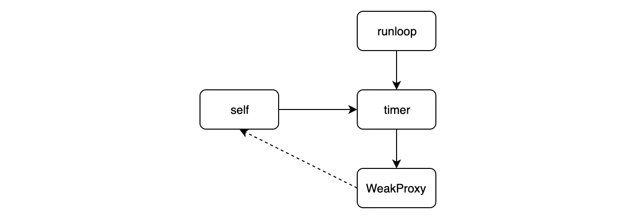 这就形成了 self → timer → self(target) 的循环持有链。只要 self 不释放,dealloc 就不会执行,timer 就无法在 dealloc 中销毁,self 始终被强引用,永远得不到释放,循环矛盾,最终造成内存泄漏。