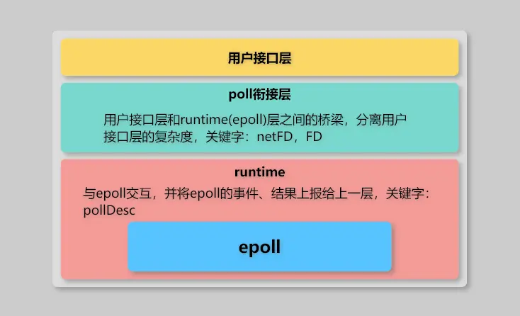 现在我们大致清楚了 epoll 在 Go 中的封装结构:netFD将接口逻辑转发到FD,FD提供了用户接口层到 runtime 之间的逻辑处理,且FD是通用抽象逻辑,适用于文件和网络连接;poll.pollDesc抽象了与 runtime 交互的接口和逻辑,而 epoll 的逻辑则被拆分到runtime/netpoll.go和runtime/netpoll_epoll.go中,整个结构渐渐式,分工责任明确,大致层次结构如下: