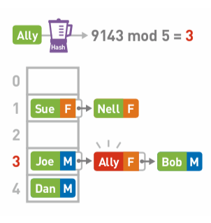 例如,Nell的mod结果为1,此时下标为1的地址中已经有了Sue元素,此时使用链表在Sue后面添加Nell即可。