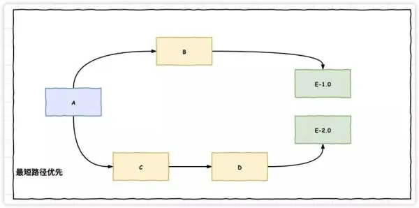 A 间接依赖两个版本 E,这种情况下,由于 A 到 E-1.0 路径最短,所以 A 中将会使用 E-1.0。